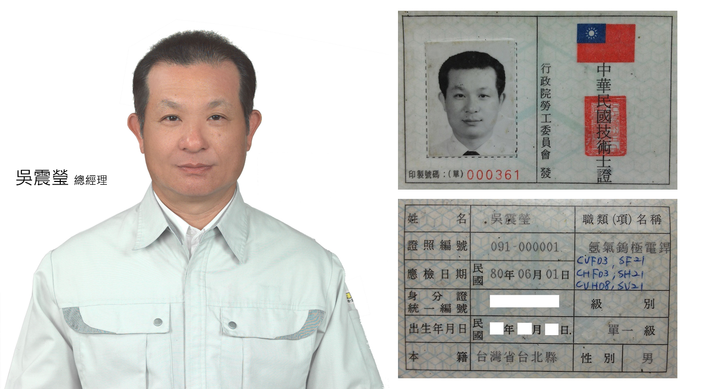 為了提供客戶真正專業焊接技術服務,我們不僅每年前往日本原廠接受培訓,提升員工技術,更要求員工需具備現場技術問題解決能力,吳震瑩總經曾在日立製作所海老名焊接研究所進修鈦合金焊接技術,更是職訓局開辦氬焊檢定證照,第一位考取氬焊證照的焊接技術人員。