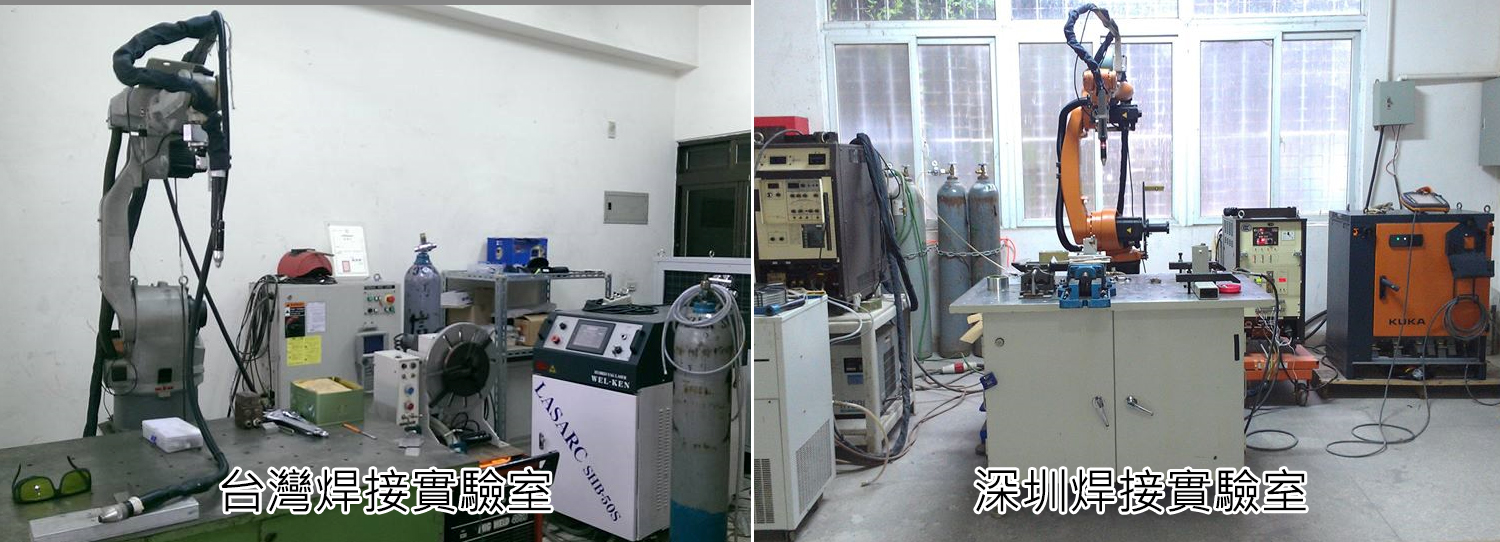 為滿足客戶需求及提升焊接技術水準,我們陸續投資在台灣與大陸分別成立焊接實驗室,針對客戶焊接問題同步展開研究,可以快速回應客戶需求,公司現有焊接研究設備有直流變頻式電離子焊接機、交直流變頻式電離子焊接機、複合式YAG雷射焊接機、交流/直流氬焊機、CO2半自動焊接機、等離子切割機、焊接用旋轉台等等,並購入產業用機械手臂,製作各式夾治具,以對應客戶不同需求進行相關焊接研究及焊接自動化產品開發。