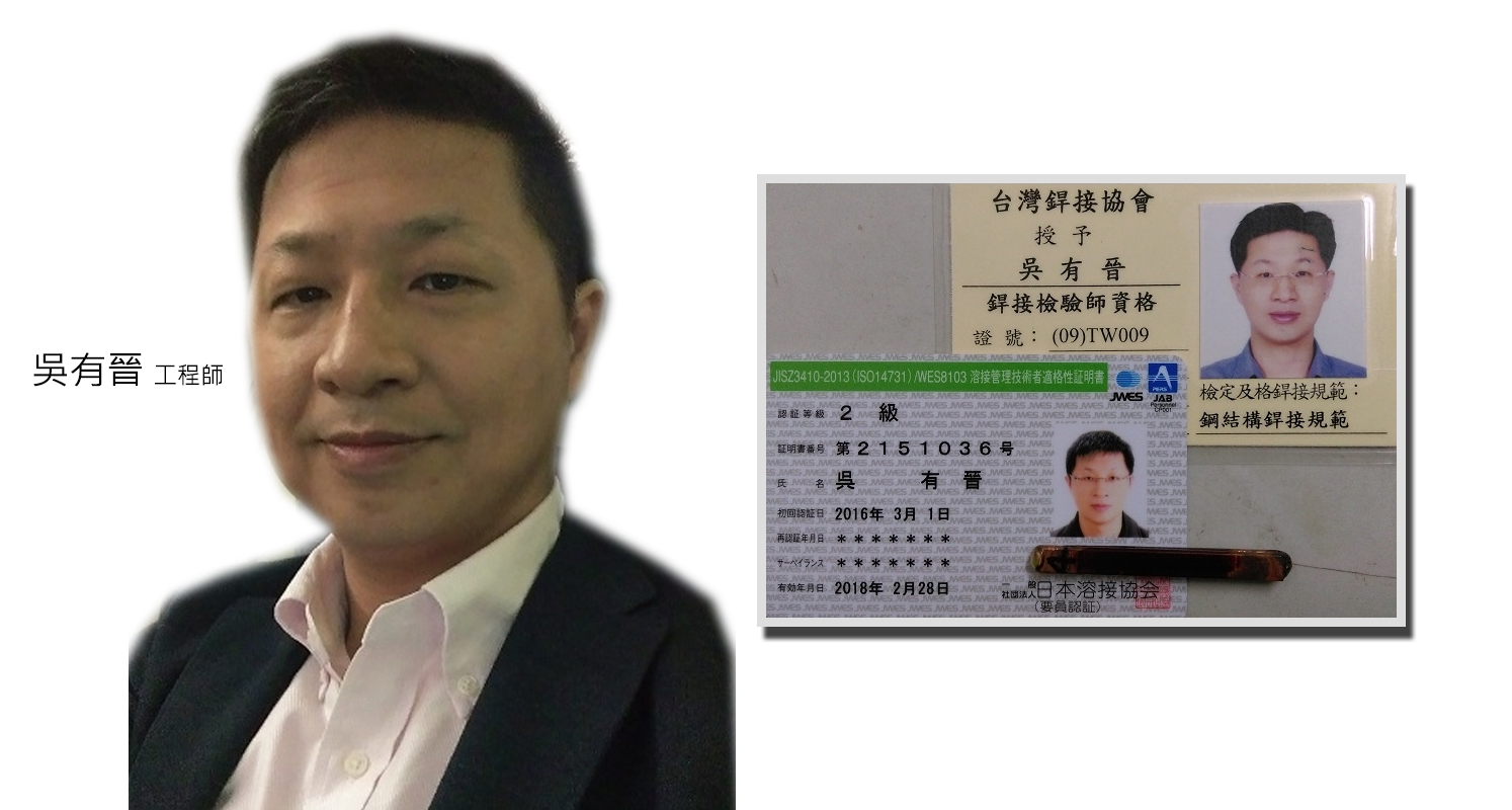為了提供客戶真正專業焊接技術服務,我們不僅每年前往日本原廠接受培訓,提升員工技術,更要求員工需具備現場技術問題解決能力,吳震瑩總經曾在日立製作所海老名焊接研究所進修鈦合金焊接技術,更是職訓局開辦氬焊檢定證照,第一位考取氬焊證照的焊接技術人員。
